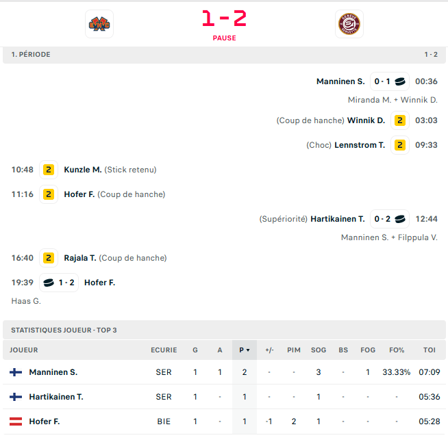 Deux minutes de pénalité contre Hofer pour dureté excessive.