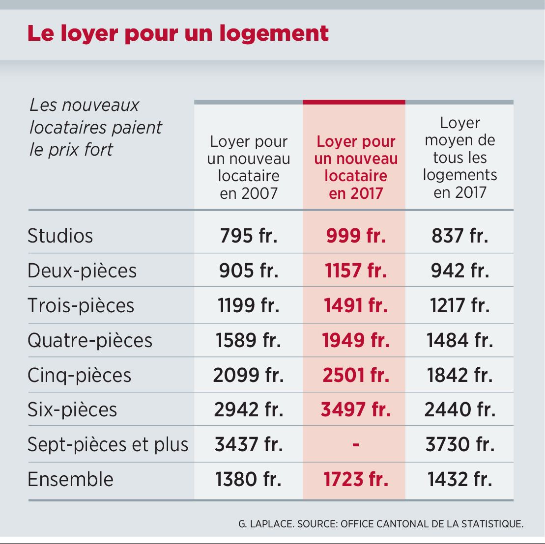 Pour les trois-pièces, le rapport est identique. On passe de 866 francs à 1483 francs. La différence est plus sensible avec les grands appartements. Le prix du six-pièces a doublé, passant de 1700 francs environ à 3500 francs.