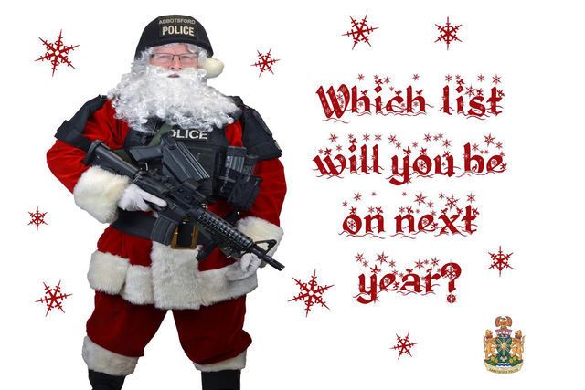 Bob Rich, le chef de la police d'Abbotsford, près de Vancouver (ouest), tente de ramener les gangsters dans le droit chemin en leur envoyant des cartes de voeux de Noël où il figure en Père Noël policier de choc, portant casque, gilet pare-balles et mitraillette.